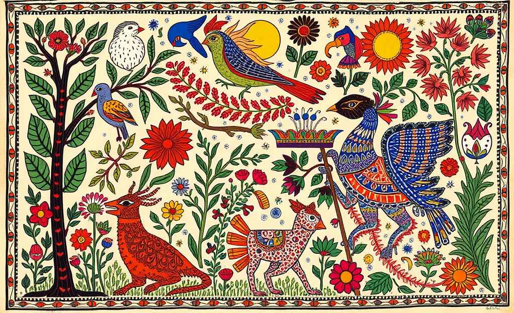 Originating from the Mithila region of Bihar, India, Madhubani painting is a traditional form of folk art known for its intricate patterns and vibrant colors. The paintings often depict nature, animals, and mythological themes, and are characterized by their use of geometric shapes, floral motifs, and fine detailing. Traditionally, Madhubani art was done on mud walls, but now it is commonly created on paper, cloth, and canvas.