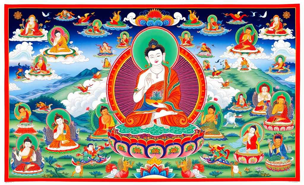Thangka paintings are traditional Tibetan and Nepalese religious artworks that are typically created on cotton or silk fabric. These vibrant paintings usually depict Buddhist deities, mandalas, and scenes from the life of the Buddha. Thangkas are often used as teaching tools in Tibetan monasteries and can range in size from small, portable pieces to massive murals.